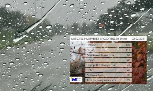 Στα Δερβίζιανα καταγράφονται 50 χιλιοστά βροχής, στην Πάργα 48, στην Παραμυθιά 41, στα Λεπιανά Άρτας 32 και στην Αγία Κυριακή Θεριακησίου 29 χιλιοστά βροχής.